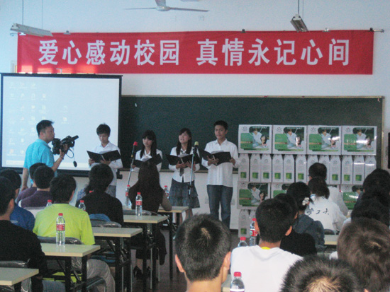 学生处处长代表学校为地震灾区的80余名学生每人送了一床被子。她说,希望这被子在夏日为同学们带来凉意,冬日为同学们带来温暖。同学们激动的泪水夺眶而出。来自地震重灾区的学生尹小龙说:这一年我们感受到了国家和学校太多的关爱,唯有心存感恩,努力学习,才是对国家和学校最大的回报。