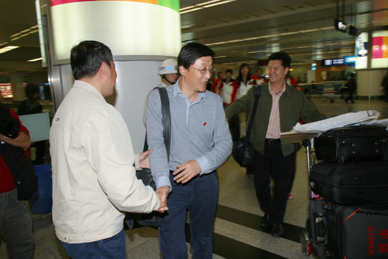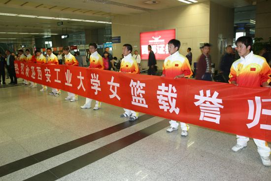 (本网讯)日前,在第30届大学生世界五球锦标赛上,代表中国出战的米兰网页版女篮,以7战全胜的战绩为中国捧回冠军奖杯。米兰网页版女篮“九朵金花”辗转飞行16小时后,于4月27日19:30抵达西安咸阳国际机场。米兰网页版副校长张君安到机场欢迎女篮载誉归来。